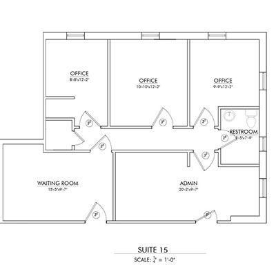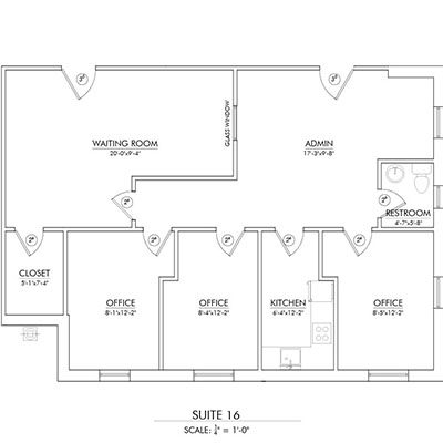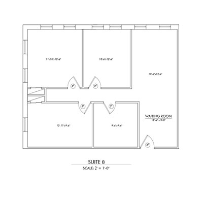 Suites have flexible floor plans that are customizable per renter’s needs. Please contact us to discuss and we can build a floor plan that suits your business’s needs. SAMPLE FLOOR PLANS from current suites: